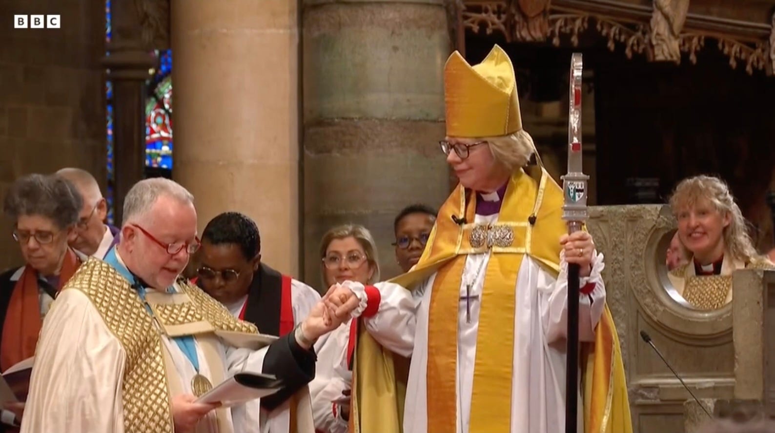 There’s not masses to say about the service. It was broadcast live on TV and you can watch it back here if you’re so inclined. Even if the traditional liturgy and hymns leave you cold, there were lots of lovely swooping camera shots of the cathedral’s vaulting nave and some fun African dancing. We got the traditional moment when the new archbishop comes to the closed door of the cathedral and has to bang her pastoral staff on it three times to be let in. Inside, she then has to talk her way past three local schoolchildren before being allowed to process up the aisle and actually be installed in her cathedral.