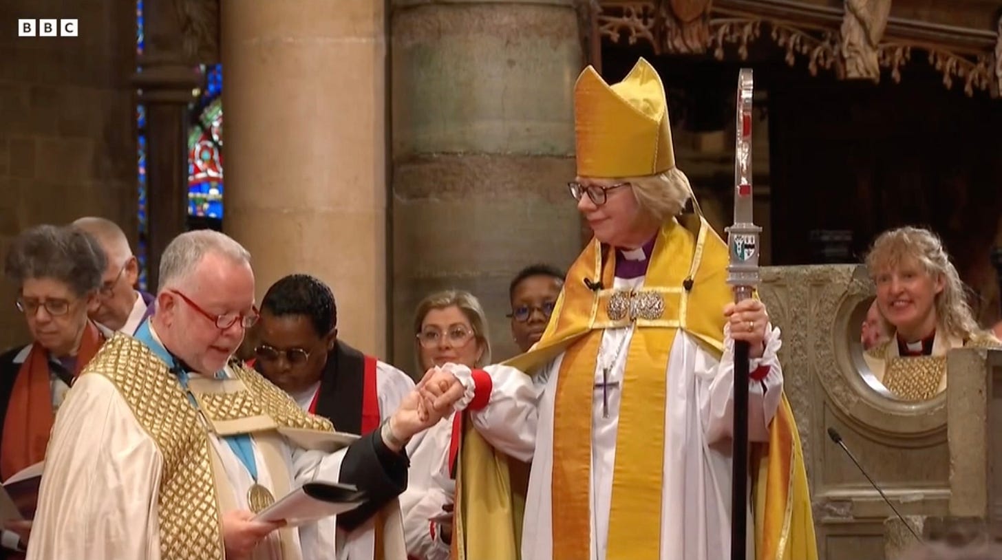 They go in hard in particular on the Bishop of Ebbsfleet Rob Munro, the sole conservative evangelical bishop in the C of E who has a special role to minister to parishes who have rejected their official bishop because they are female. And yet despite Munro being a close bedfellow of the Gafcon lot and attending all their meetings, he was not just part of the enthronement service, his bishopric (while national in scope) technically falls within Canterbury diocese and so Mullally will be his superior.